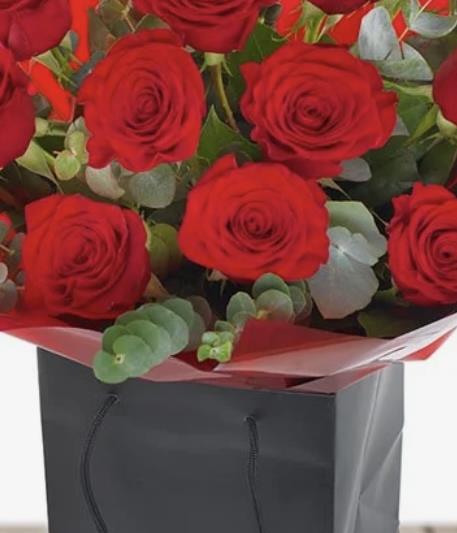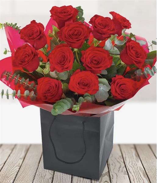 A beautifully romantic bouquet of one dozen red Roses. Impeccably presented and ready to display. 12 Red Rose, Aralia Leaf, Salal, Eucalyptus.