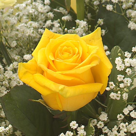 Classic golden Roses, yellow Carnations and Gypsophila are united for this birthday hand-tied.