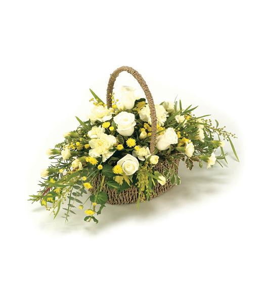 A delightful Sea grass basket arrangement containing white Roses & Carnations together with yellow Chrysanthemums & Mimosa. Size: Height - 28cm (11") Length - 50cm (20").